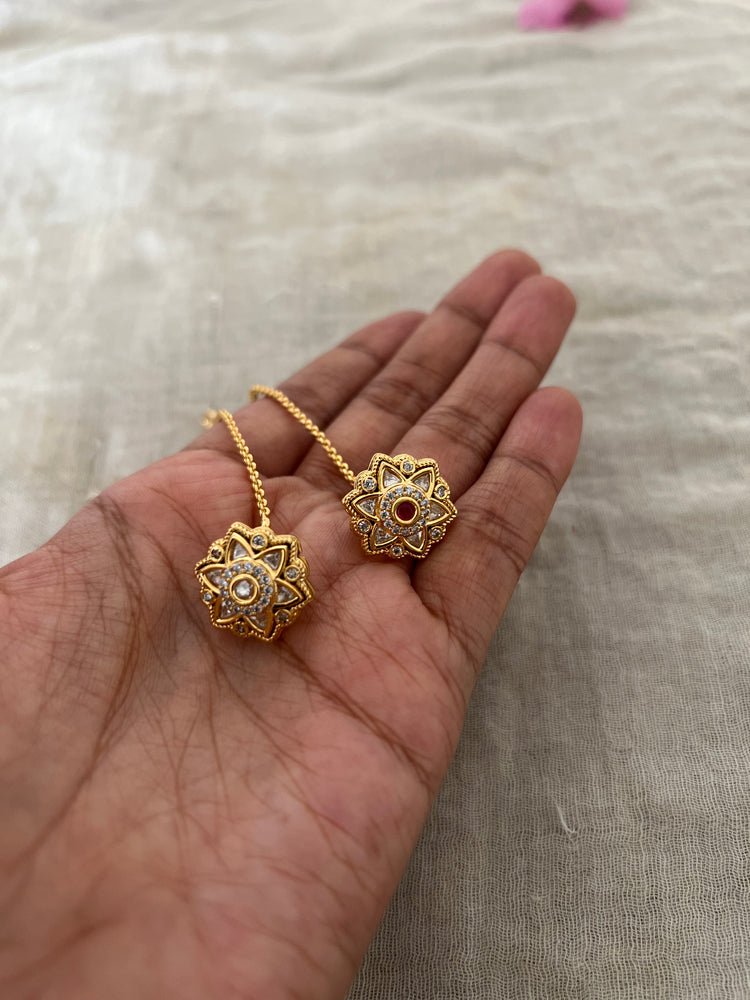 ⦁ Central Gem Accents: Each has a bright central stone—one in classic white, the other in bold ruby red—outlined with intricate polki Kundan work and gold filigree for a radiant finish.