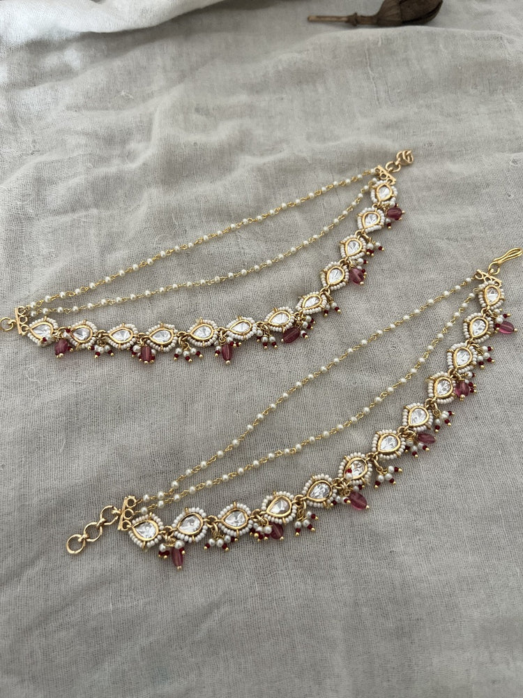 The Ziya chains are distinguished by a graceful three-tiered structure. Two delicate strands of lustrous pearls cascade elegantly, creating a soft, luminous frame. The final, most ornate layer features radiant, teardrop-shaped Kundan-style stones, each surrounded by a halo of tiny pearls. The design is brought to life by the addition of deep, ruby-hued faceted teardrop beads that dangle below, offering a rich pop of color and enchanting movement with every turn of your head.